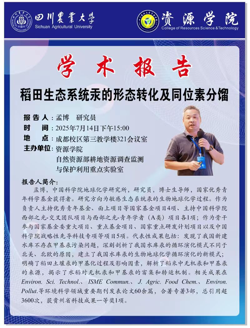 资源学院学术报告:稻田生态系统汞的形态转化及同位素分馏